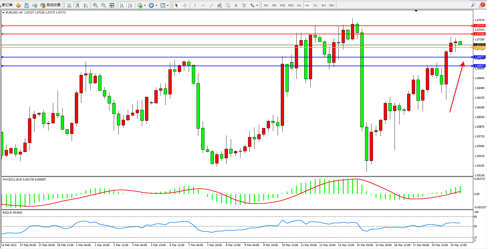 4小时图看:多头动力延续上行趋势走势持续,市场整体处于偏多头,短期有继续向上移动态势,MACD指标处于多头区域缓慢上行,RSI指标处于50均衡线上側徘徊;