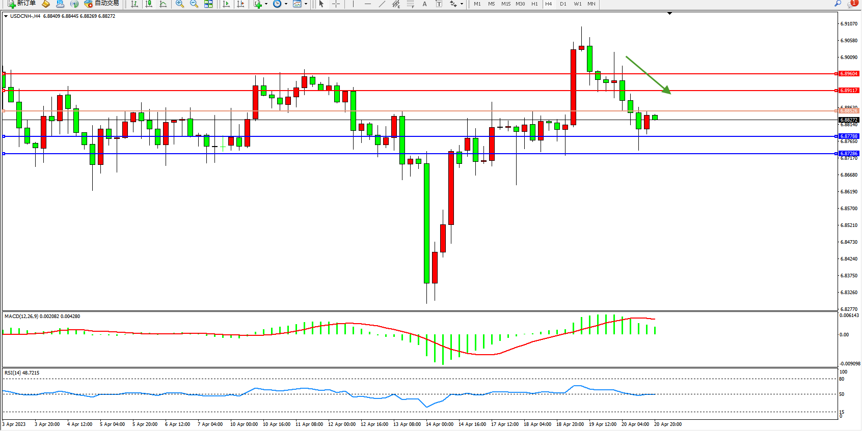 备选策略:6.88256上方看涨,目标6.89117  6.89604