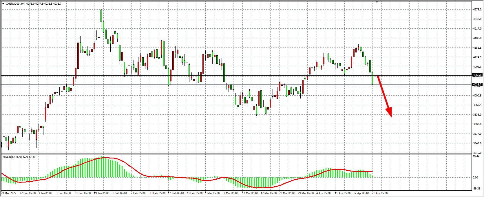 4小时图看,沪深300进一步走低,短期走势已破位,MACD量能即将下穿零轴,4065的支撑已转化为阻力,在4060之下看跌,下方目标4000-3940。