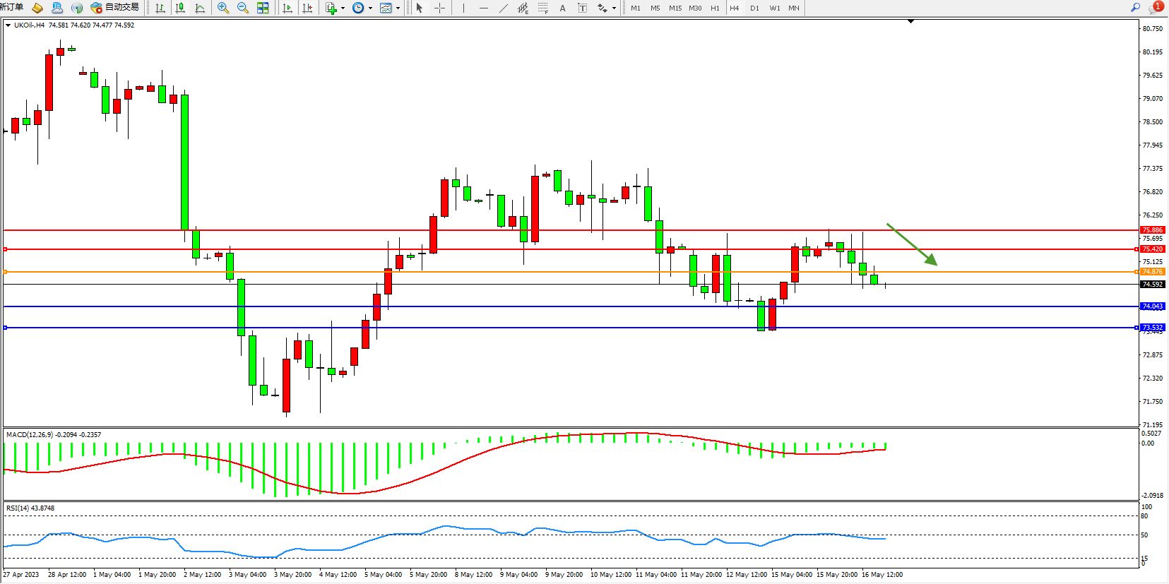 交易策略:74.876下方看跌,目标74.043  73.532