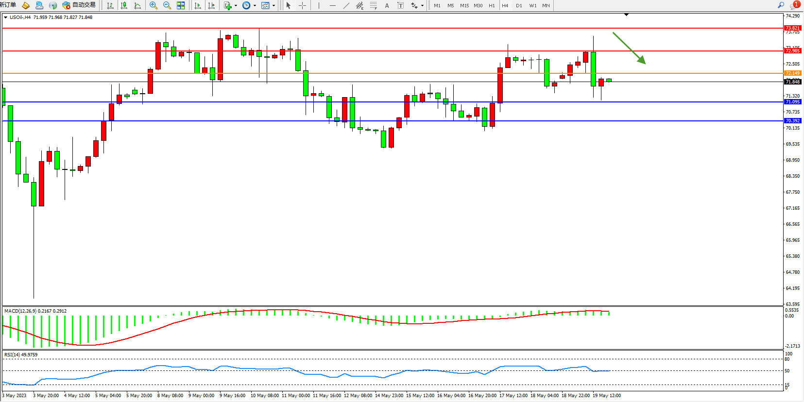 交易策略:72.149下方看跌,目标71.095  70.392