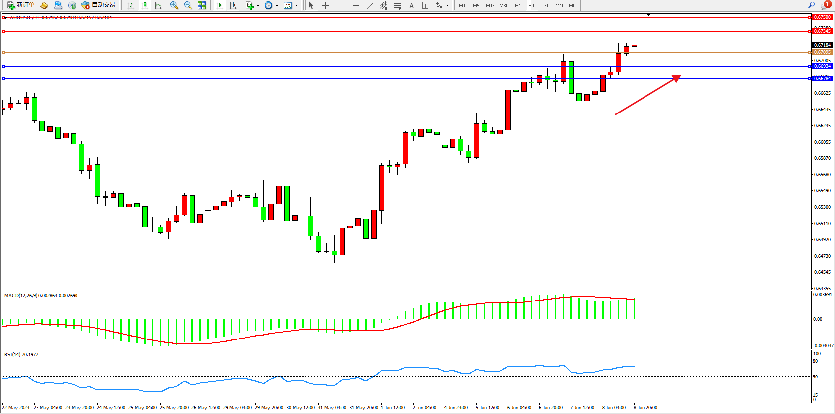 交易策略:0.67095上方看涨,目标0.67345  0.67500