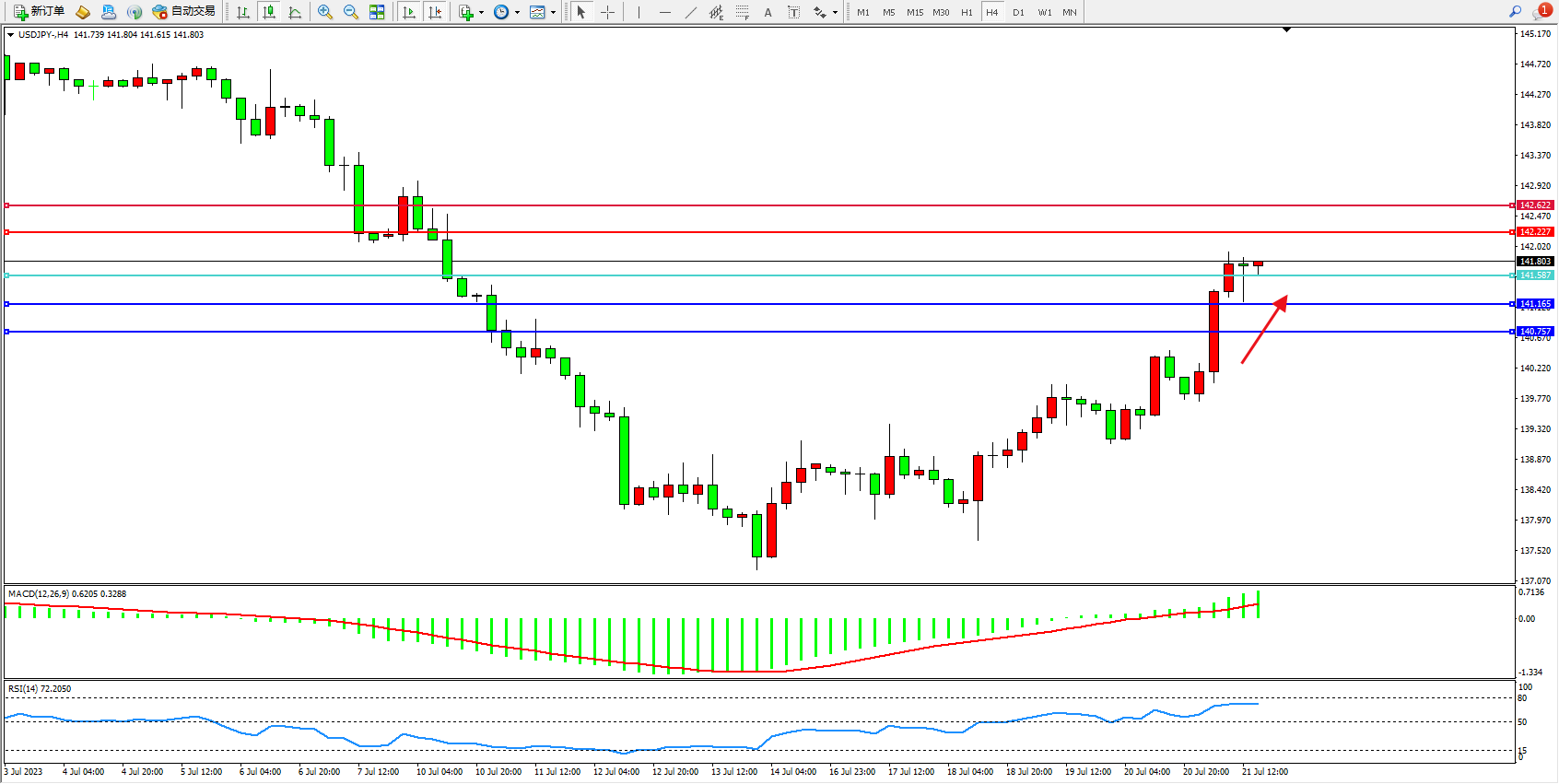 交易策略:141.587上方看涨,目标142.227  142.622