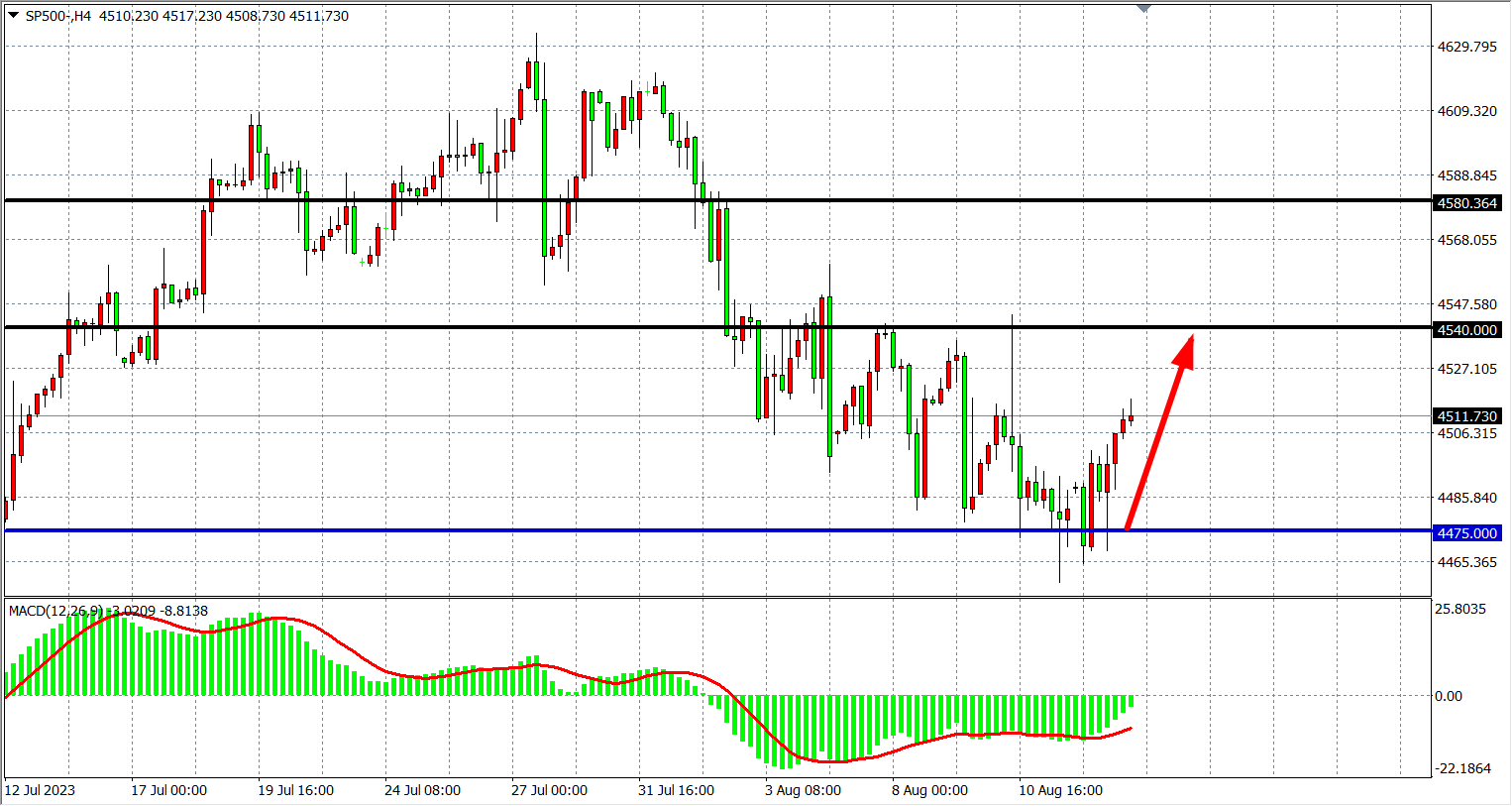4小时图看,标普围绕4500附近继续震荡,MACD量能在零轴下缩量,行情走势仍较疲弱,支撑关注4475附近,阻力关注4540附近。