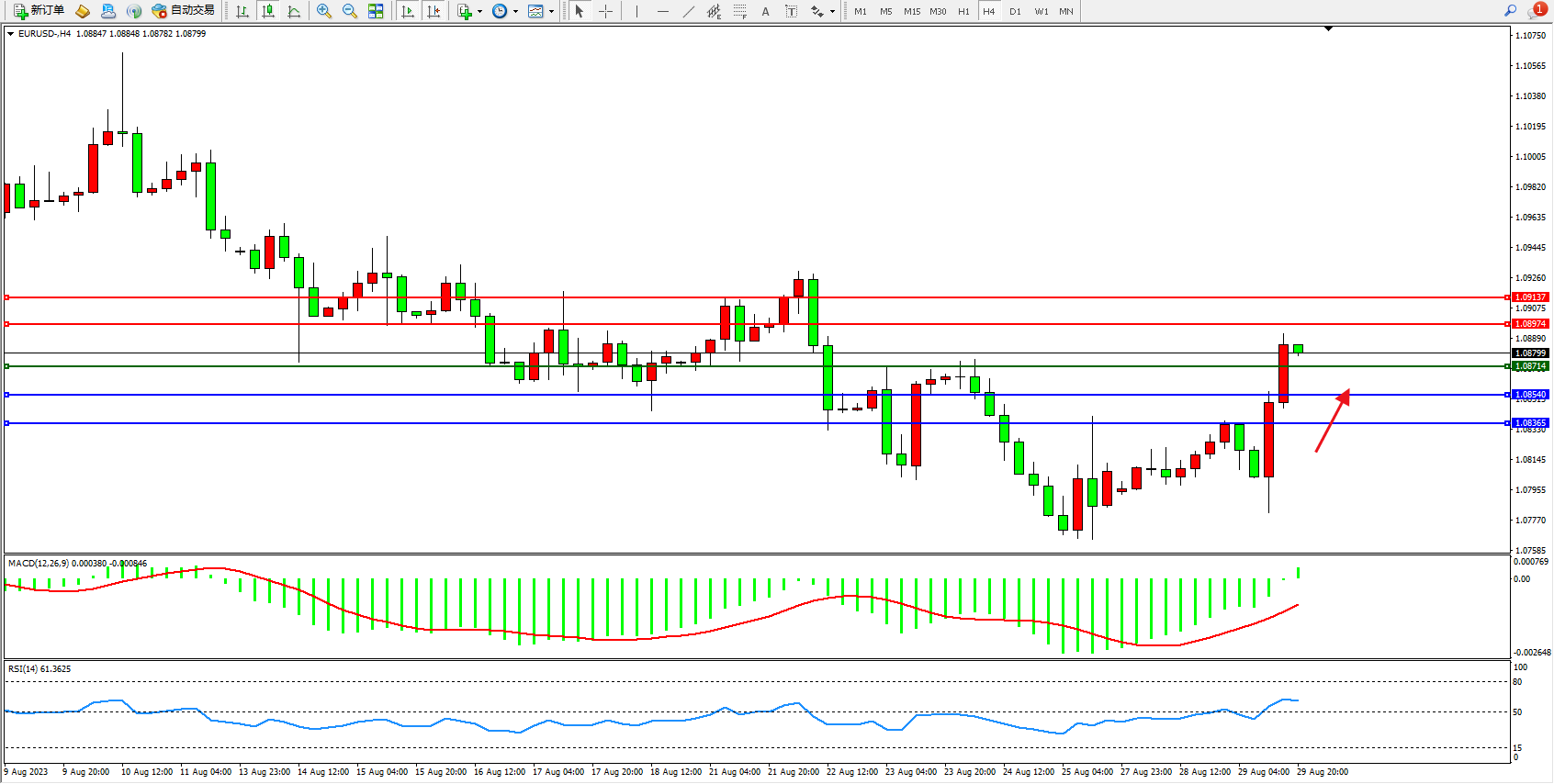 欧元美元EURUSD—4小时K线图显示: