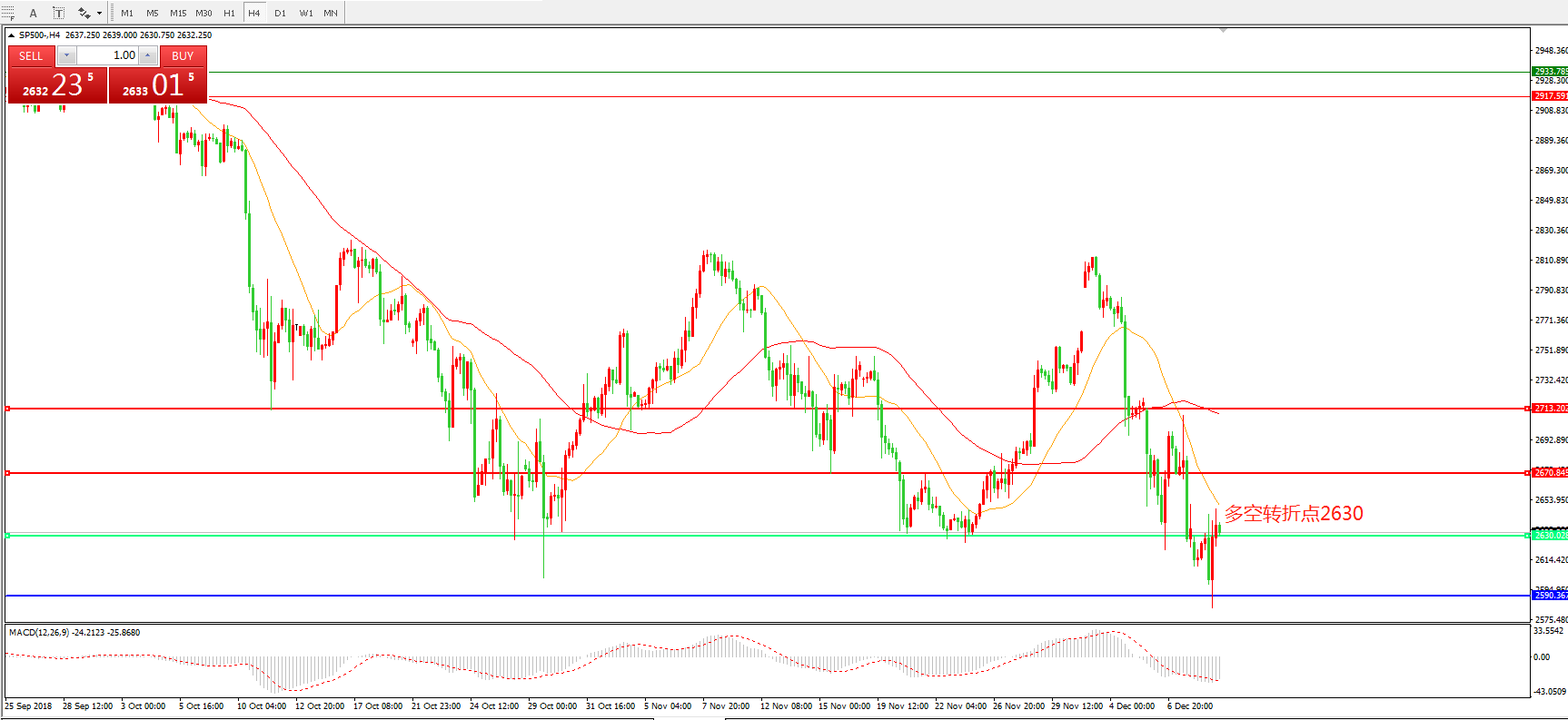 4小时图看,标普500连续下破关键支撑获得反弹,但整体价格直接跌至均线系统之下, MACD绿柱缩短,短期震荡下行的概率较大。