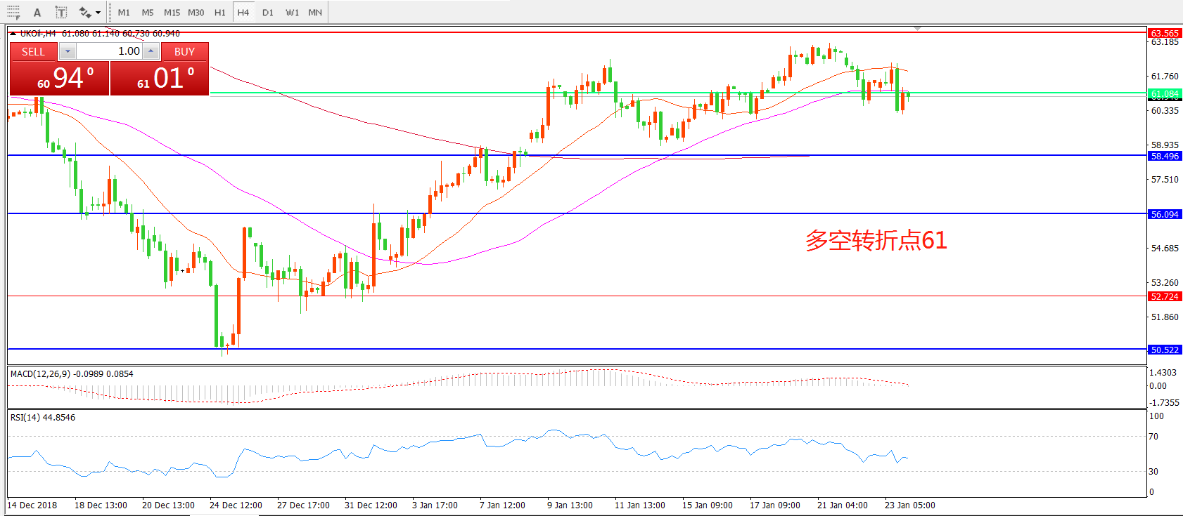 4小时图看,油价经过连续整理站稳61美元,短期整理后受制于63美元关口, 均线系统呈多头排列, MACD红柱增加,重点关注上方阻力。