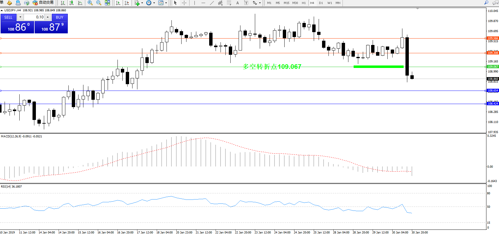 交易策略:109.067下方看跌,目标108.654108.424
