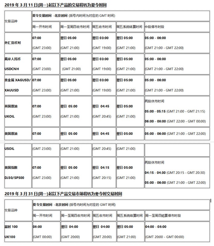 由于北美时区市场2019310(周日)欧洲时区市场2019331(周日)开始分别进入夏令时, 以下产品交易时间将随时区转变调整为令时交易时周一开盘时间不变,周二至周四停市结算时间较冬令时提早1小时,周六收盘结算较冬令时提早1小时敬请留意