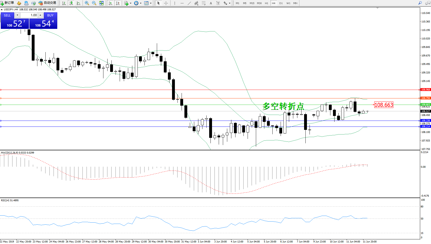 交易策略:108.663下方看跌,目标108.336108.214