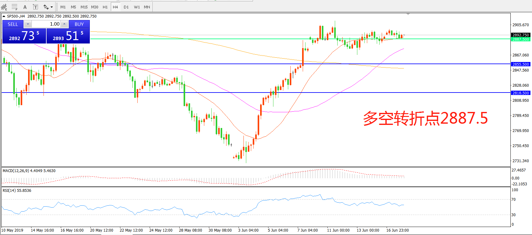 4小时图看,标普延续高位窄幅高位震荡走势,2887.5依然是短期争夺焦点,短期均线走平,MACD红柱减少,RSI指标走平,日内延续震荡思路概率较大。