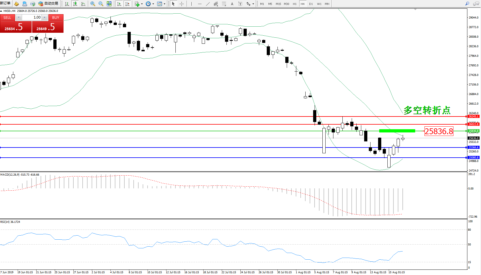 香港恒生指数8月16日(周五)收盘上涨238.76点,涨幅0.94%,报25734.22点;恒指早上低开,随后沽盘再现扩大跌幅,恒指低见25314。有买盘追入而反弹再倒升,高见25700,虽然恒指出现反弹,然而大势依然未见改善,特别是原先以为贸易关系会有缓和迹象,但中方立场转趋强硬,顿时令关系双方关系再变得紧张,亦令隔晚美股出现震荡;若再加上本地因素的话,相信恒指仍难言回稳。预期短期仍有较大机会下试25000点水平。