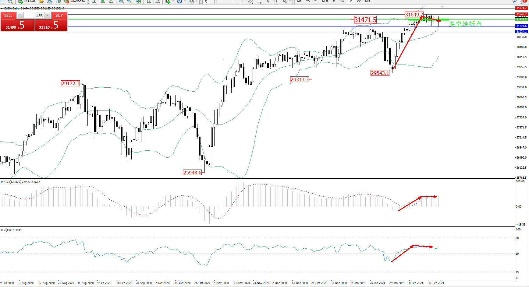 技术点评:高位呈V型反转态势强势拉升上扬,高位抵达31649附近节点遇阻开始维持窄幅整理,处于布林带指标中上轨区间持续窄幅震荡,布林带指标呈缓慢张口走势持续中,多头动力维持整理平移态势,MACD指标处于多头区域持续整理上移中,RSI指标处于多头区域维持持续徘徊整理中;