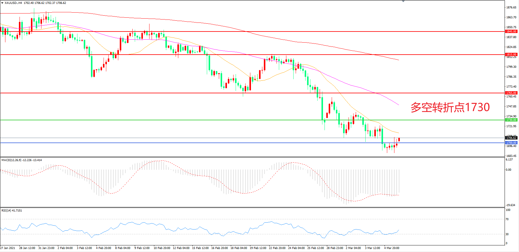上周五(3月5日),美国非农就业数据公布,非农就业人口大增37.9万人,好于市场预期,为去年10月以来最大增幅。靓丽的数据表现推动了美元的攀升,也冲击了黄金市场,现货黄金遭遇大幅抛售,震荡下行后收报1698.97美元/盎司,刷新9个月新低,当周振幅超60美元。周一(3月8日),金价跳空高开,但整体依然处于空头压制之下。