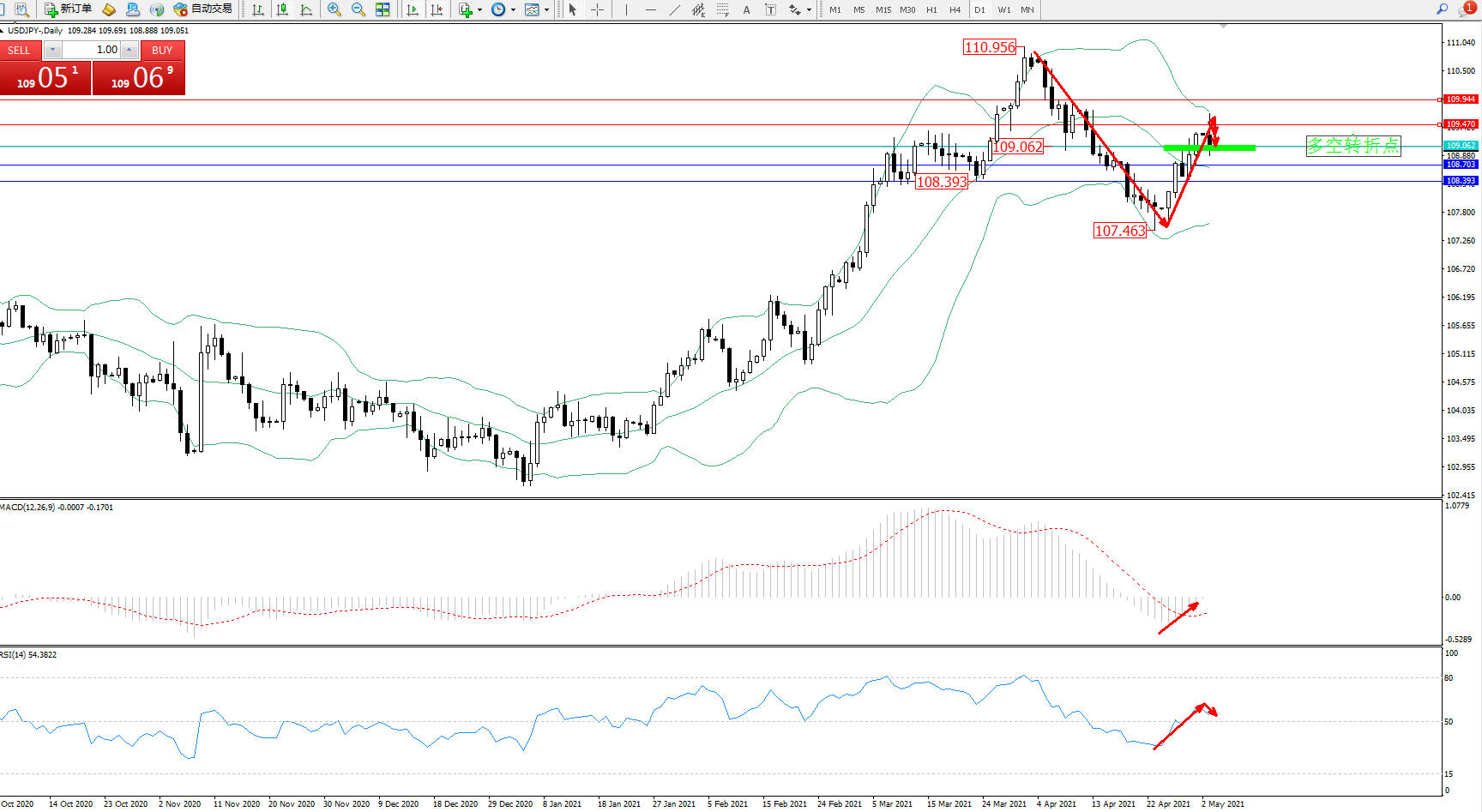 技术点评:高位空头动力延续空头下行走势持续下挫,触及布林带指标下轨附近节点后不断向下移动,空头动力下行至107.463附近得到支撑短暂整理后急速回升,突破中轨触及上轨附近后遇阻开始回撤,布林带指标呈张口走势后开始缓慢收口中,MACD指标处于0轴线下方空头区域持续震荡后开始有回升迹象,RSI指标处于空头区域整理后急速反转上行,在50均衡线节点上方弱势震荡;