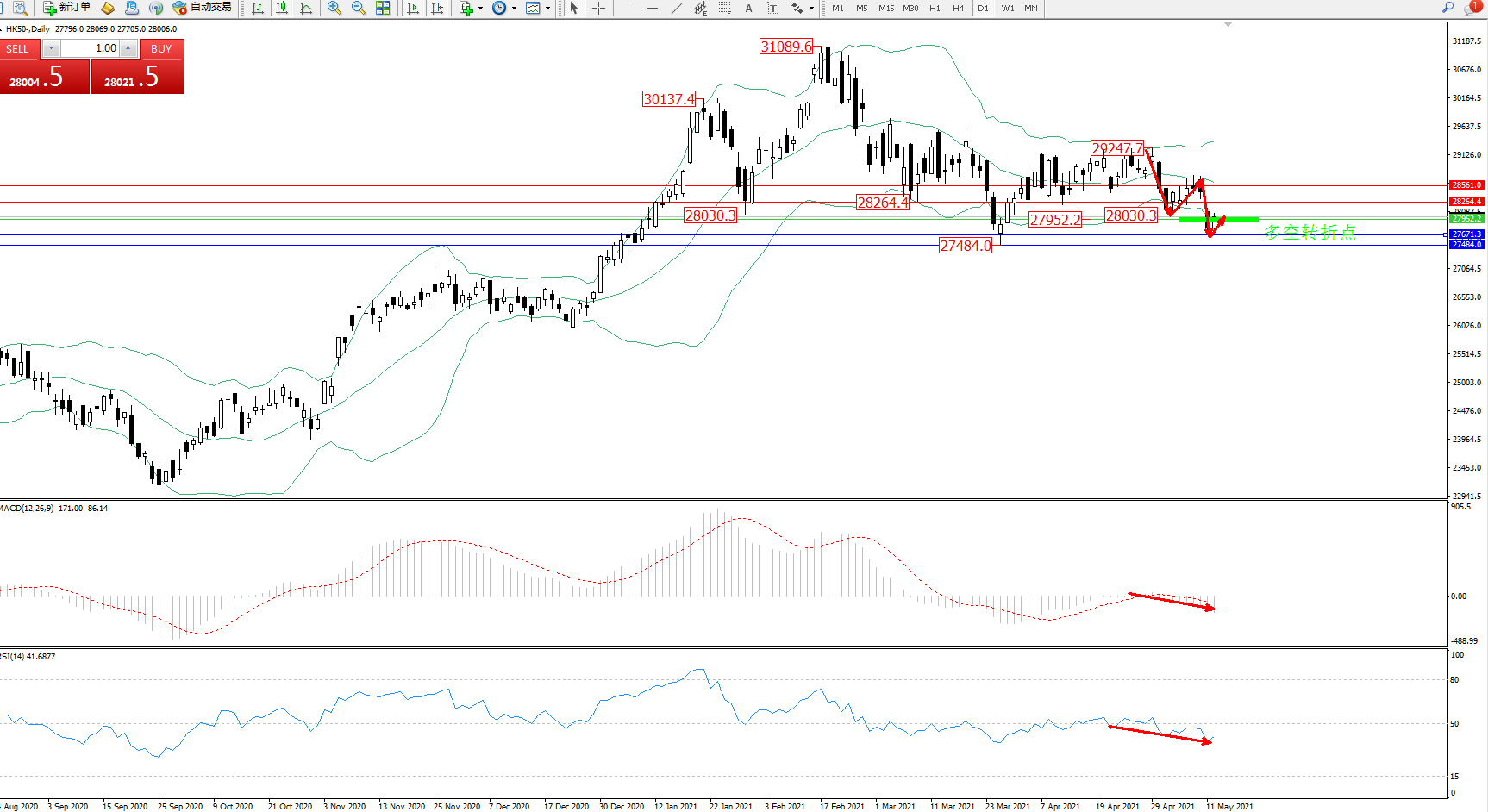 技术点评:长时间维持在布林带指标中上区间持续窄幅震荡后,空头动力伺机开始入场,呈阶梯式震荡下行,跌破布林带指标下轨附近节点后得到短暂支撑开始震荡,有继续向下移动态势,布林带指标呈缓慢张口走势中,前期低位27484位置近在咫尺破位在即,MACD指标处于0轴线下方弱势徘徊中,RSI指标处于50均衡线下方窄幅震荡向下移动;