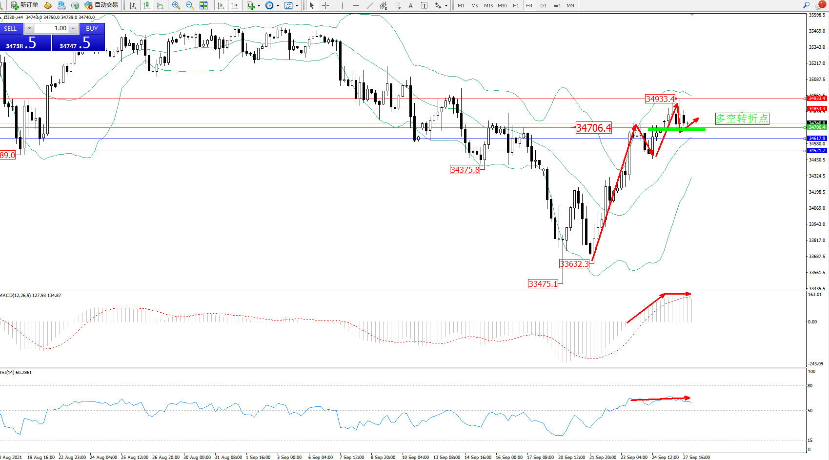 技术点评:低位多头动力强势反转上扬,高位抵达34933位置节点后开始震荡,短期多头动力上行后开始出现遇阻,布林带指标呈收口走势中,MACD指标处于多头区域维持整理平移,RSI指标处于多头区域持续震荡中;
