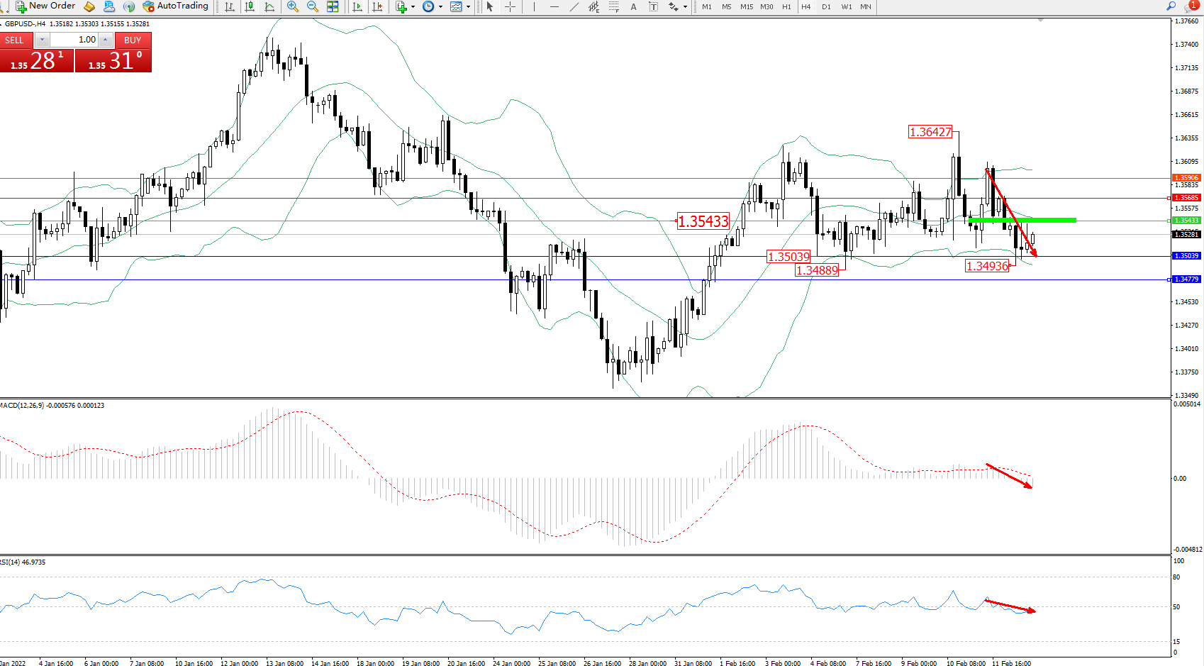 交易策略:1.35433下方看跌,目标1.35039、1.34779