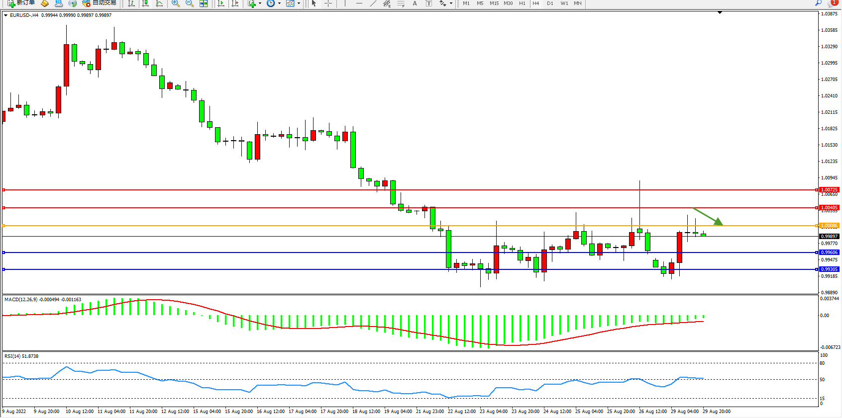 欧元美元EURUSD—4小时K线图显示: