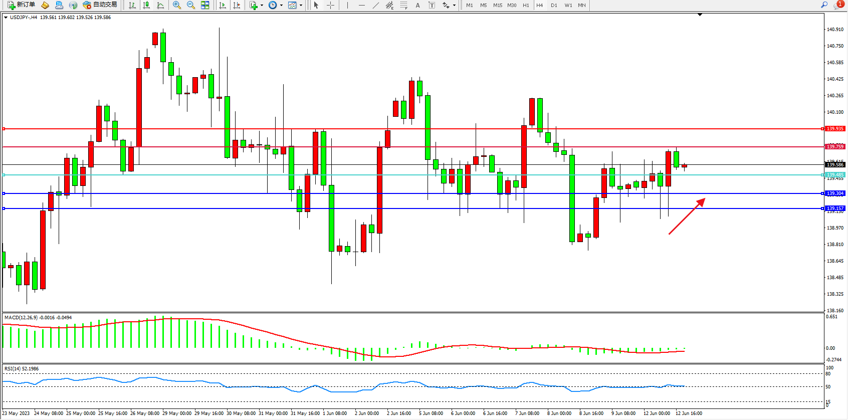 4小时图看:多头动力维持窄幅整理缓慢上行,市场看涨情绪依旧,短期有继续向上移动迹象,MACD指标处于0轴线下侧弱势徘徊,RSI指标处于50均衡线附近弱势徘徊;