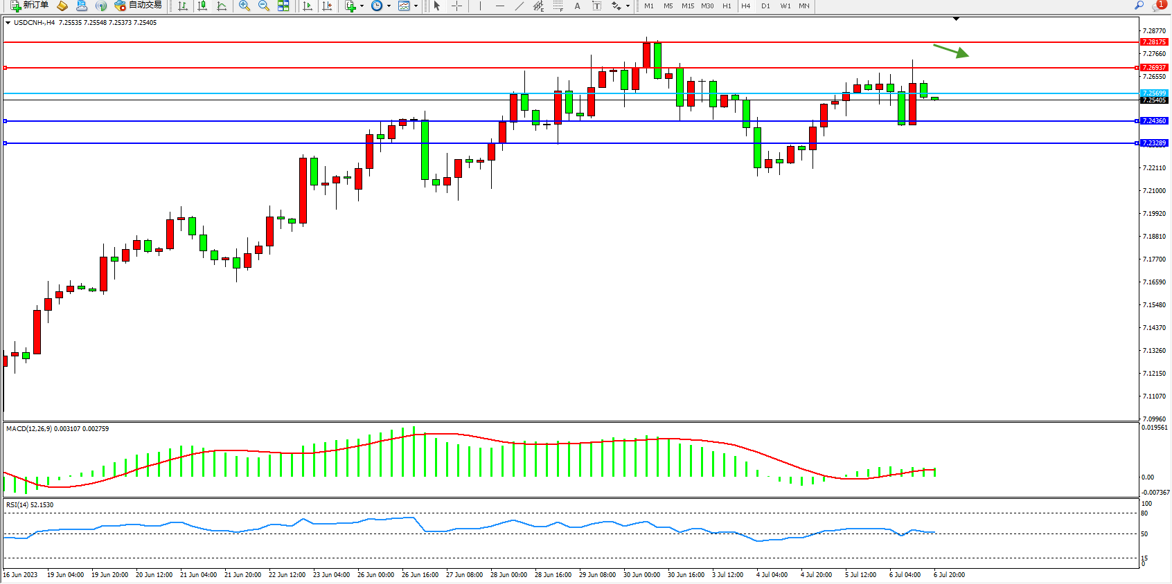 交易策略:7.25699下方看跌,目标7.24360 7.23289